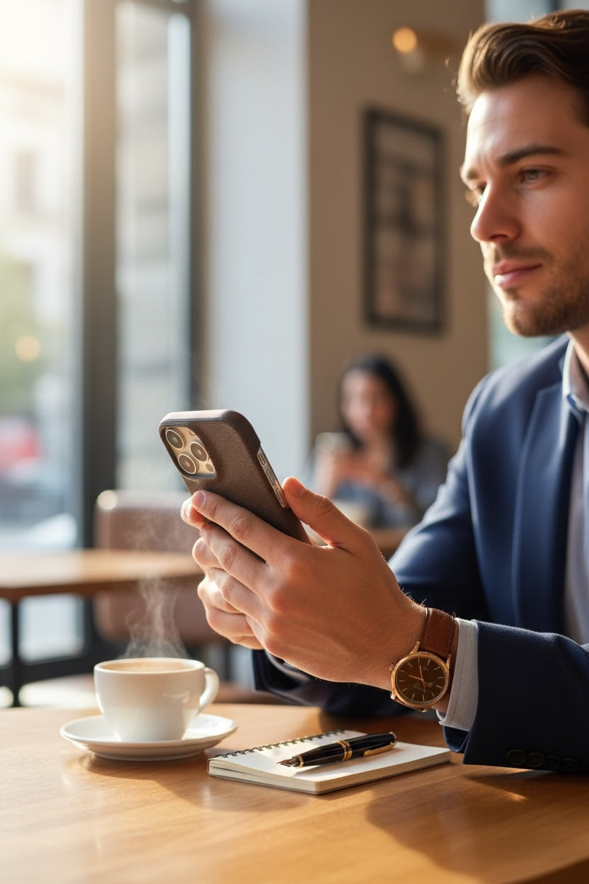 "Protege tu teléfono con estilo con nuestra elegante funda de piel Air Leather Case. Delgada y ligera como el aire, su diseño exclusivo deja al descubierto los laterales para un acceso fácil y un borde alto en cámara y esquinas elevadas en pantalla para una protección completa. Siente la calidad y el lujo en tus manos."