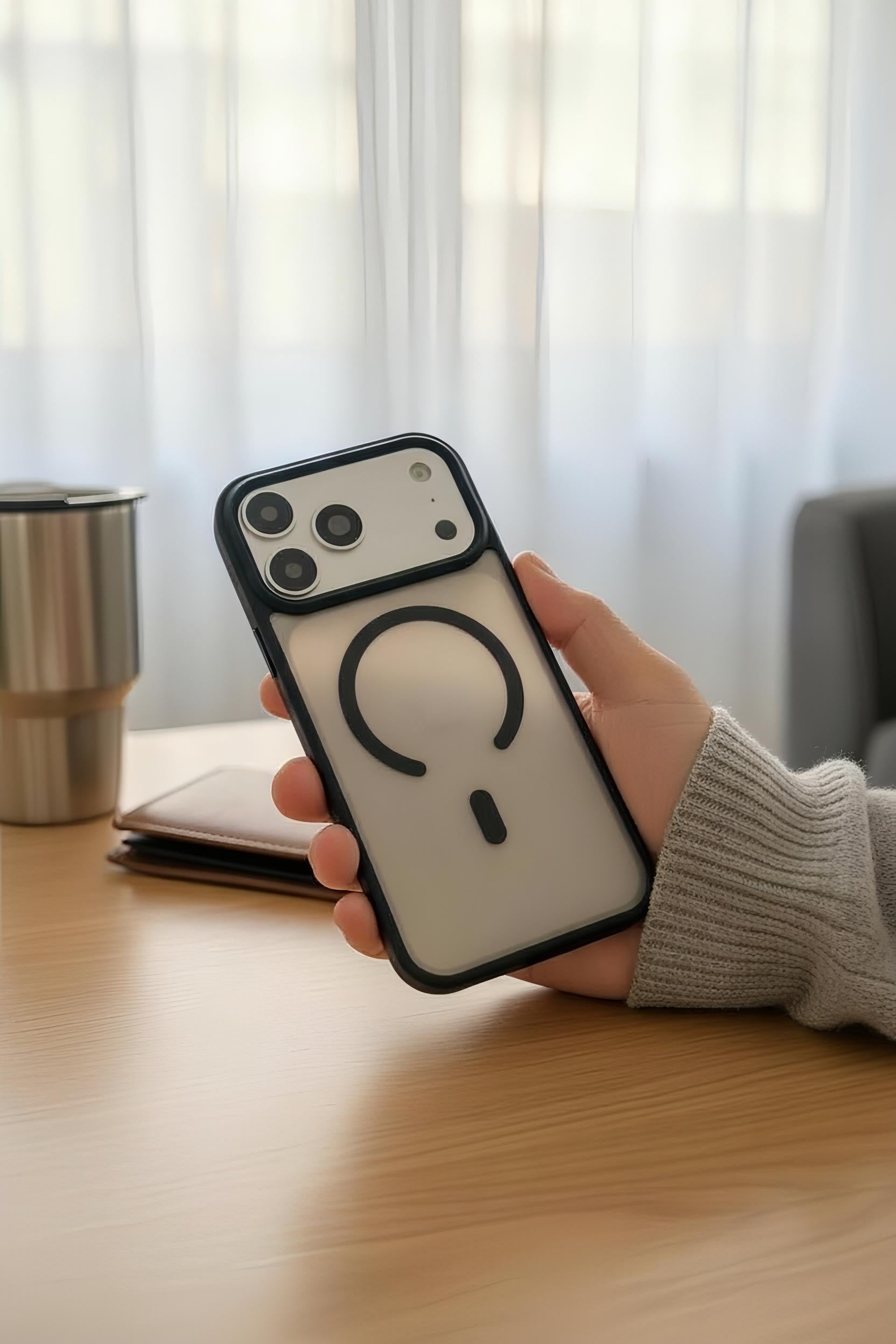 El acabado matte de alta calidad evita las huellas y ofrece un agarre confortable y seguro. Su textura suave realza la apariencia del iPhone con un look moderno y discreto.