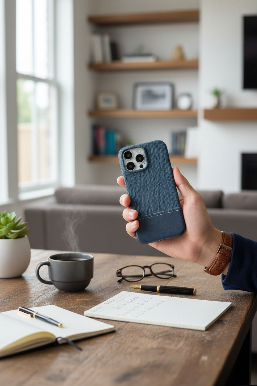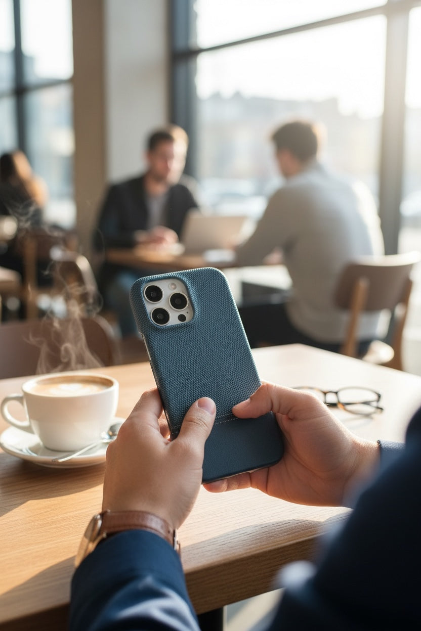 "Protege tu teléfono con estilo con nuestra elegante funda de piel Air Leather Case. Delgada y ligera como el aire, su diseño exclusivo deja al descubierto los laterales para un acceso fácil y un borde alto en cámara y esquinas elevadas en pantalla para una protección completa. Siente la calidad y el lujo en tus manos."