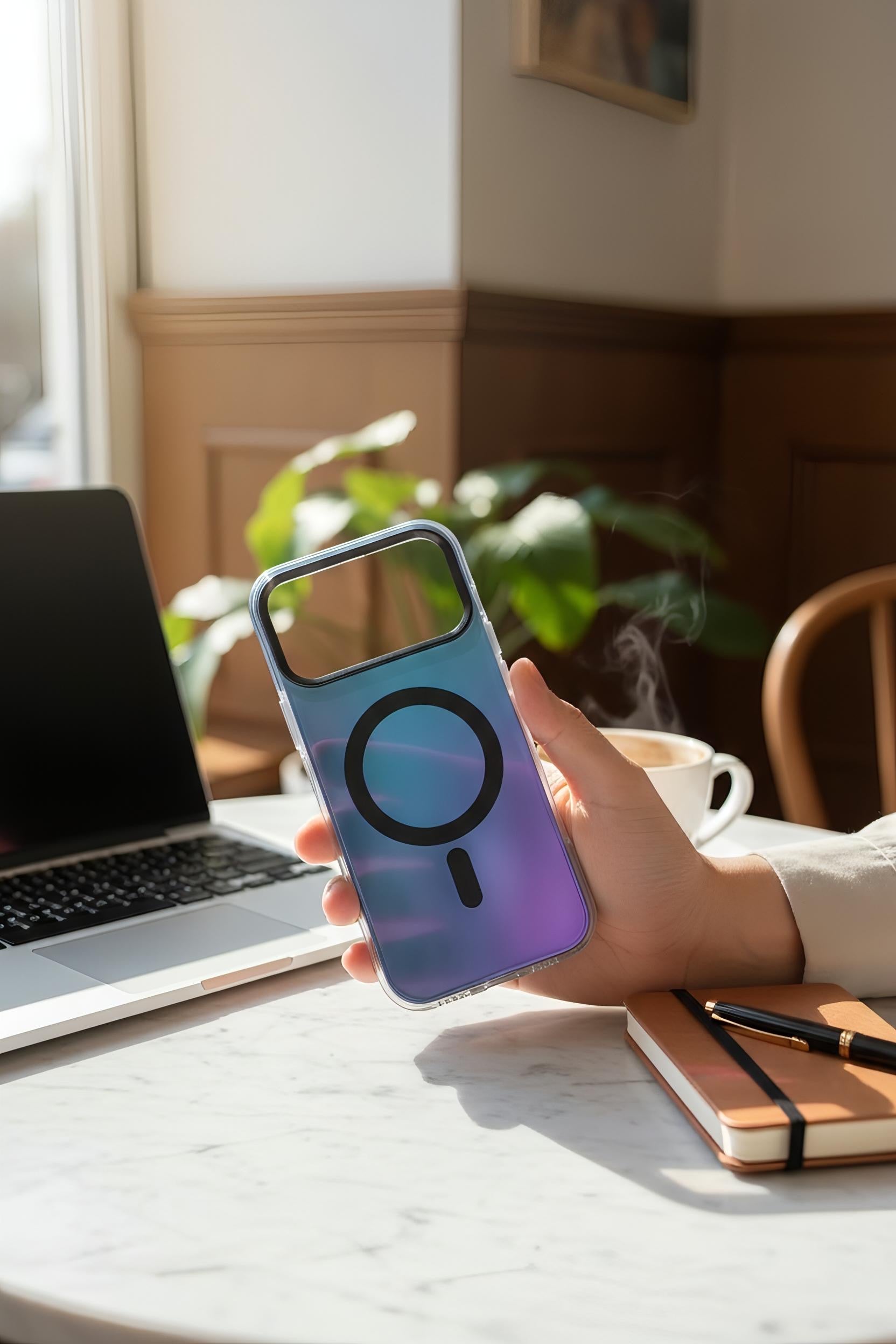 El acabado tornasol aporta profundidad y un brillo sutil que cambia con la luz, transformando tu iPhone en una pieza única. Perfecta para quienes buscan un look sofisticado sin perder practicidad.